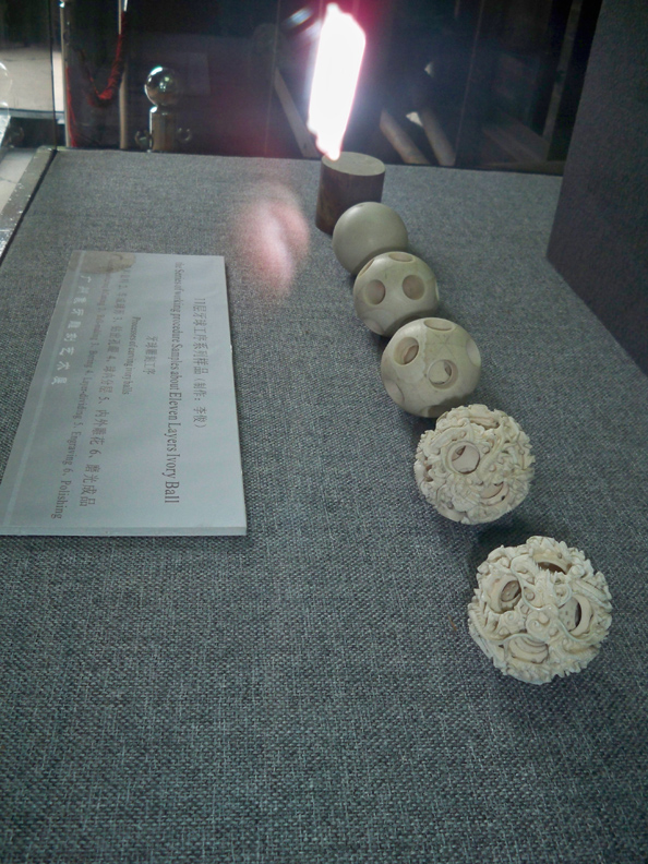 It's all carved from a single chunk of ivory. I have no idea how they can get in there to carve those inner layers. I would assume they'd have to carve the innermost layer first so they could hold it in place while working on it. If they worked on it from the outermost first everything would roll around and they'd never be able to grip anything to carve it.